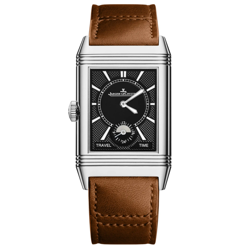 The Jaeger-LeCoultre Reverso Classic Duoface Small Seconds Q3848423 watch features an elegant design, displaying two guilloché dials, one silver and one black. It features a light brown calfskin strap that ensures sturdiness and comfort. It has a 47mm x 28.3mm stainless steel case. It incorporates a manual winding movement that provides a power reserve of approximately 42 hours. With a timeless design, the Reverso Classic is the traditional expression of the rectangular icon.