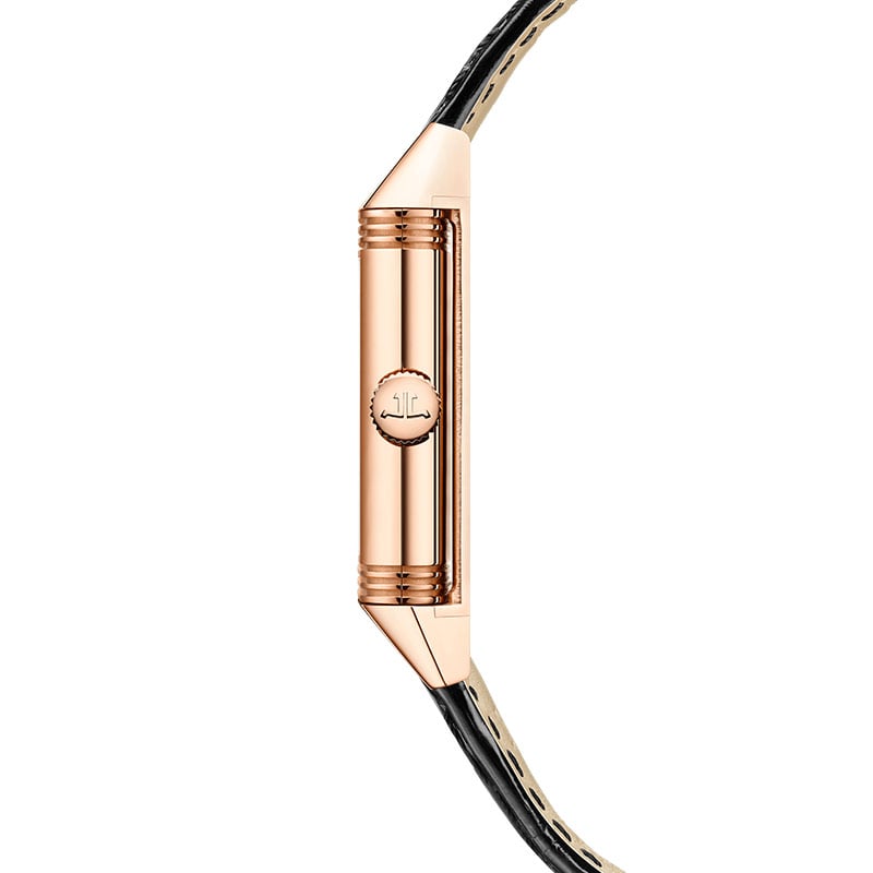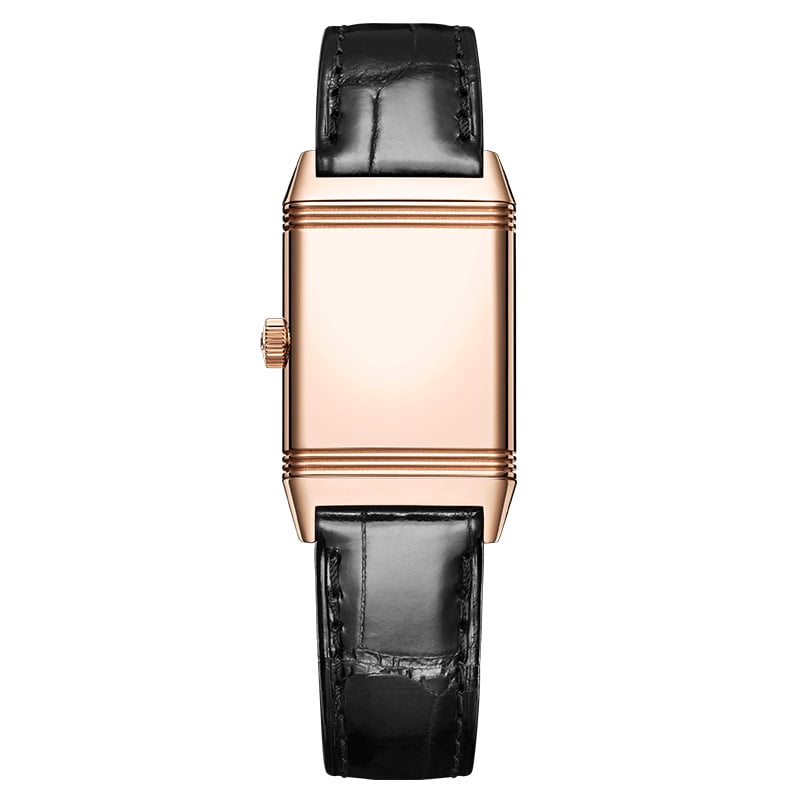 Jaeger-LeCoultre Reverso Classic Small Q2602540 watch. The Reverso Classic Small watch, with its new rose gold case topped with a black leather strap, exudes an appeal that will catch the eye of vintage treasure connoisseurs. Inside this timepiece resides a hand-wound mechanical movement: the Jaeger-LeCoultre caliber 846/1. Its restyled dial sports golden hands. Twelve transferred straight black Arabic numerals stand out against the minute track.