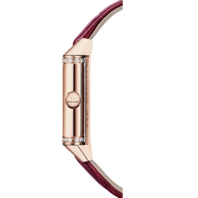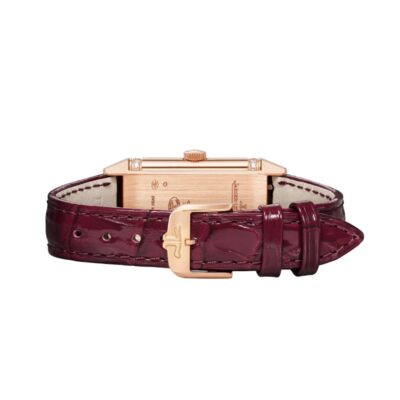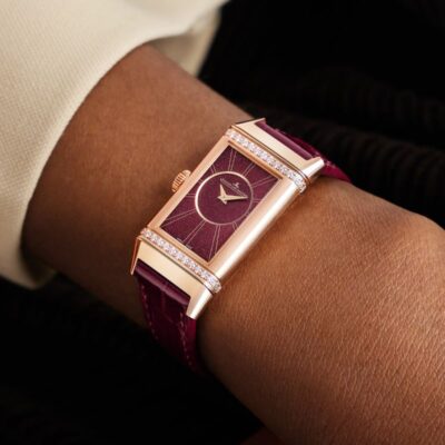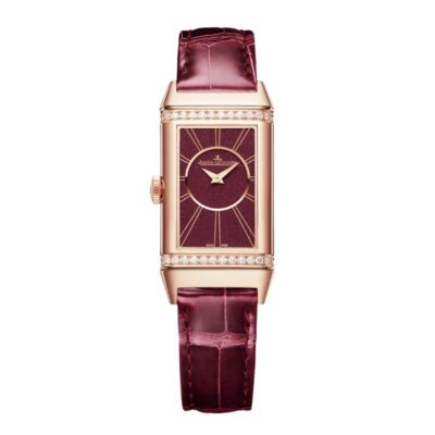 The Jaeger-LeCoultre Reverso One Duetto Q334256J watch features an elegant design, displaying two dials, one silver and one burgundy. It features a burgundy alligator leather strap that ensures sturdiness and comfort. It has a 40,1mm x 20mm pink gold case with diamonds. It incorporates a manual winding movement with calibre 844 that provides a power reserve of approximately 50 hours. With a timeless design, the Reverso is the traditional expression of the rectangular icon.