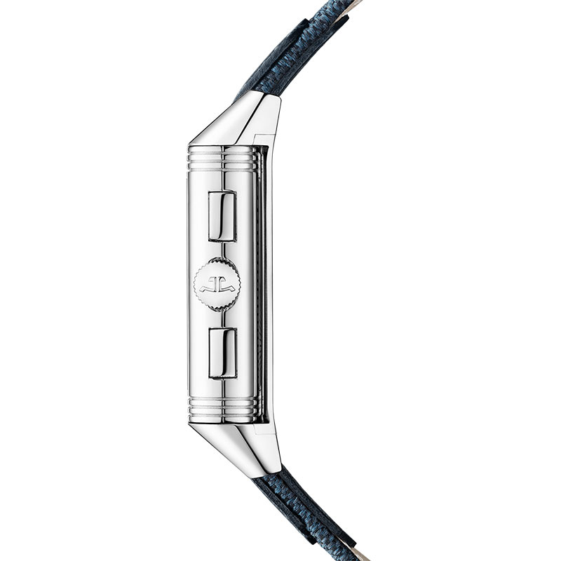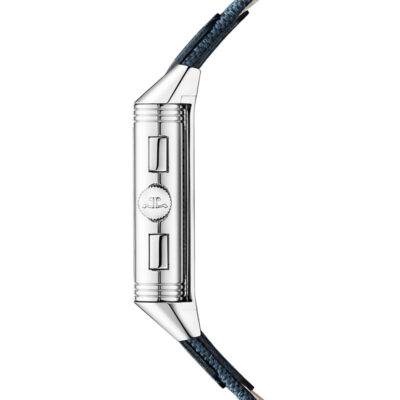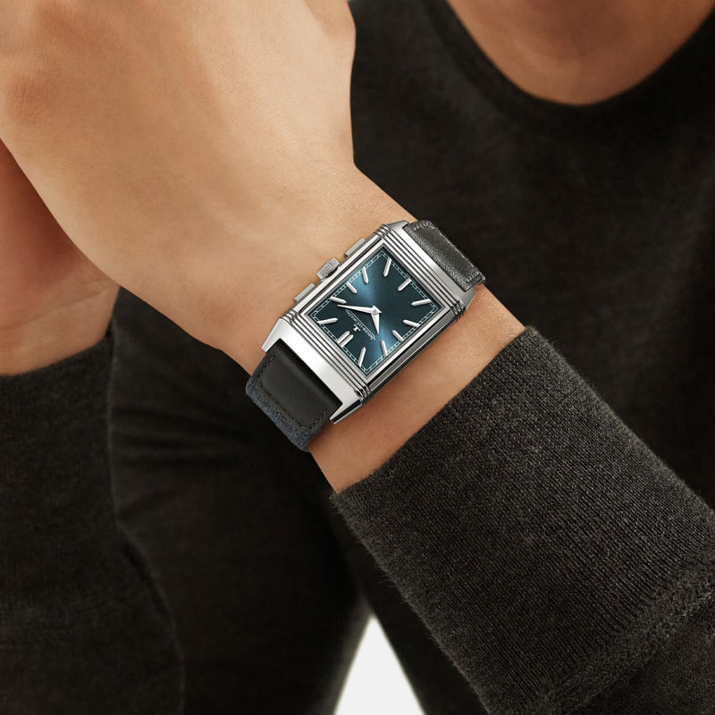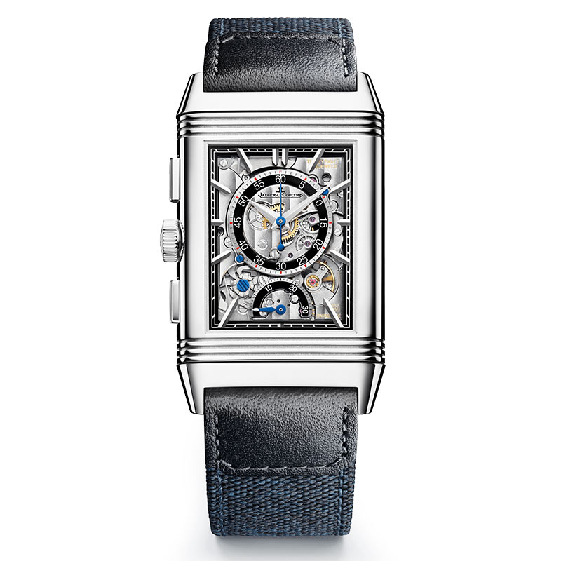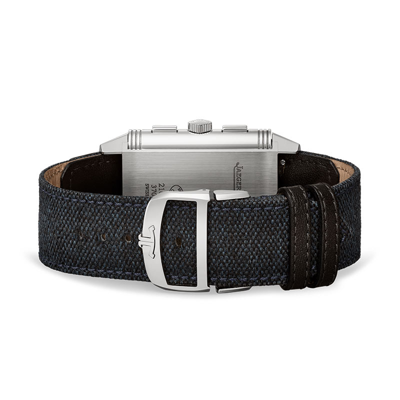 Jaeger-LeCoultre Reverso Tribute Chronograph Q389848J watch. Equipped with the Manufacture’s new caliber 860, the Reverso Tribute Chronograph has managed to meet two challenges: displaying the time on both sides and completely reinventing the display of the chronograph’s indicators in a rectangular case. Unique and versatile, the Reverso Tribute Chronograph includes a pair of interchangeable straps: one in leather and blue canvas, the other entirely in leather, designed by Casa Fagliano.