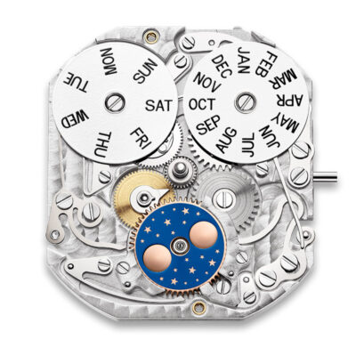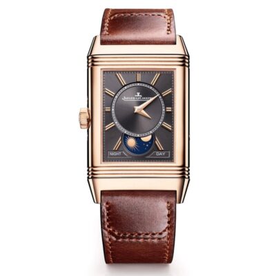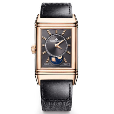 Jaeger-LeCoultre Reverso Tribute Duoface Calendar Q3912530 watch. Equipped with the Manufacture’s hand-wound caliber 853, and combining the Duoface with a full calendar, the Reverso Tribute Duoface Calendar watch offers an excellent contrast on both sides. On the front, the watch reinterprets the aesthetic codes of the Art Deco-inspired collection launched in 1931 with elegance and refinement: emblematic gadroons, applied indexes, Dauphine hands… At six o’clock, the moon phases are decorated with a discreet half-moon tipped hand in bright red indicating the date. On the back, a new dial with a sunray finish and a fascinating dark gray color incorporates a disc marking night and day, integrating perfectly into the new decor. Elegant and timeless, the watch includes a pair of interchangeable bracelets (and buckles) designed by Casa Fagliano. In leather or in a combination of two materials (fabric and leather), they bring a strong vintage character to this model.
