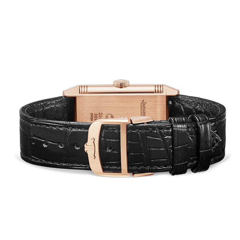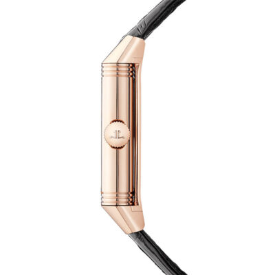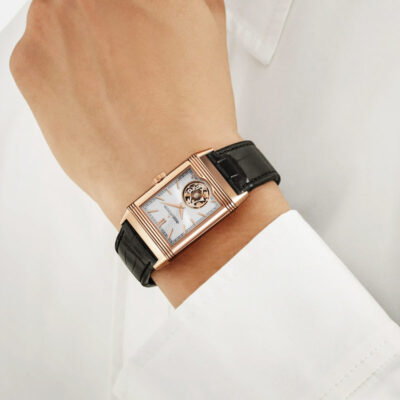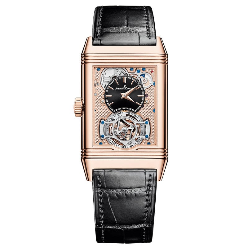 Jaeger-LeCoultre Reverso Tribute Duoface Tourbillon Q392242J watch. The Reverso Tribute Duoface Tourbillon pays tribute to the first wristwatch with rectangular tourbillon of our Maison. In its new ultra-thin rose gold case (9.15 mm), the absence of a top bridge allows a clear view of the flying tourbillon, also visible on the back. Assembled by hand in the Grande Complications Workshop, the tourbillon is incredibly light (0.455 g) despite its 62 components. This exceptional timepiece, incorporating the Manufacture’s caliber 847, also features a second time zone on the back, in a caliber just 3.9 mm thick, proof of the skill and ingenuity of our watchmakers. While the front embodies the spirit of the Reverso to perfection, turning the case we discover a level of sophistication rarely seen: gold bridges decorated with guilloché in the Métiers Rares® workshop of extraordinary crafts and an integral case with sunray engraving and a mirror-polished dial.