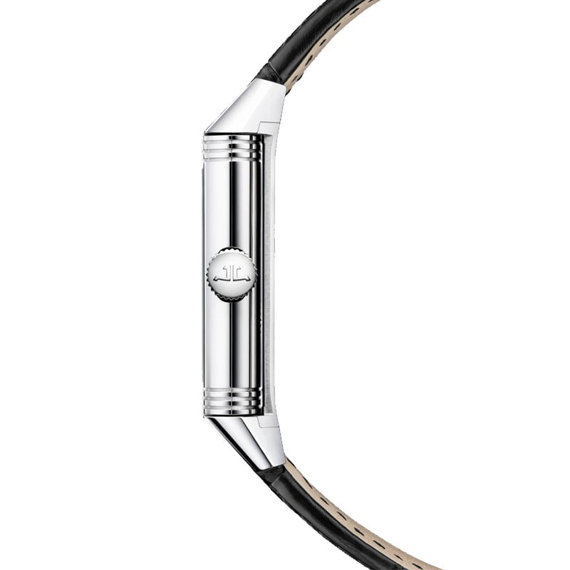 Jaeger-LeCoultre Reverso Tribute Enamel Monet “San Giorgio Maggiore” Q39334M4 watch. In its 45.6 mm x 27.4 mm white gold case, the Reverso Tribute focuses on reversible time. It incorporates a hand-wound movement with caliber 822A, which provides a power reserve of approximately 42 hours. It has a guilloché-finished dial with a subtle herringbone pattern in blue enamel. The back shows one of the painter’s works: Twilight in San Giorgio Maggiore.