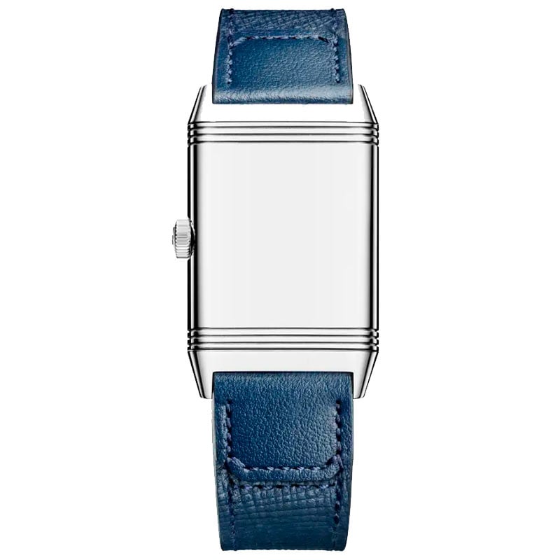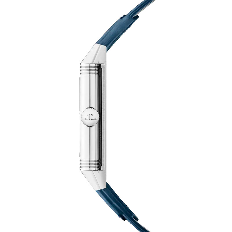 Jaeger-LeCoultre Reverso Tribute Monoface Q716848J watch. In its 7.56 mm thick stainless steel case, the Reverso Tribute Monoface focuses on reversible time. It incorporates a manual-winding movement with caliber 822A, which provides a power reserve of approximately 42 hours. The blue lacquered dial with sunray brushed finish and Dauphines hands evoke the Art Deco-inspired aesthetic codes of the first Reverso created in 1931.