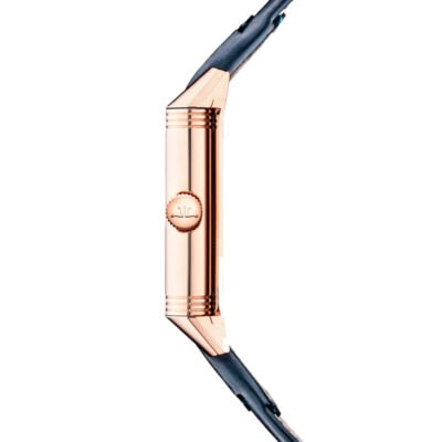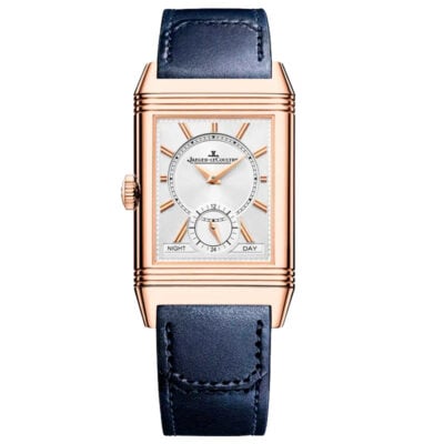 Jaeger-LeCoultre Reverso Tribute Duoface Small Seconds Q3982590 watch. In its 9.613 mm thick rose gold case, the Reverso Tribute Duoface focuses on reversible time. It incorporates a hand-wound movement with caliber 854, which provides a power reserve of approximately 42 hours. The sunray-finished deep blue lacquered front dial, the sunray-finished silver Reverso dial and the Dauphines hands evoke the Art Deco-inspired aesthetic codes of the first Reverso created in 1931.