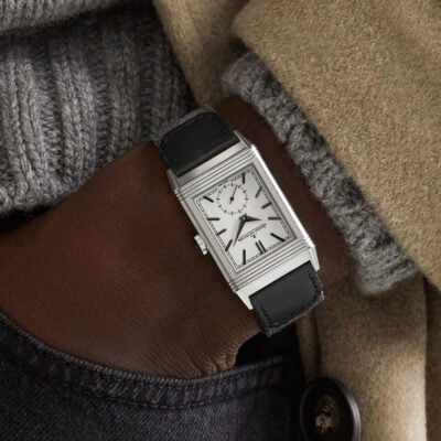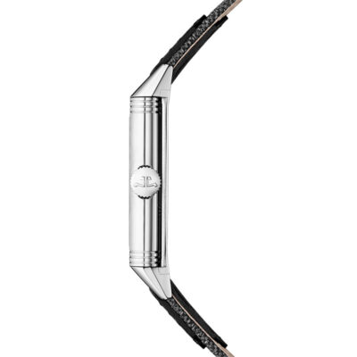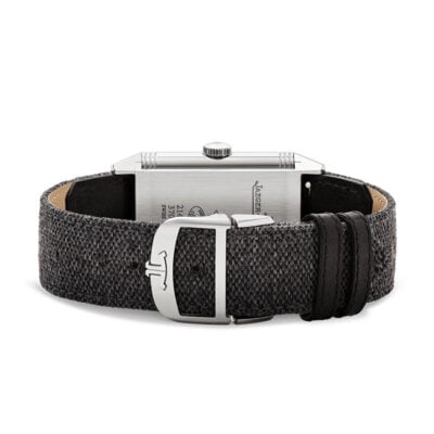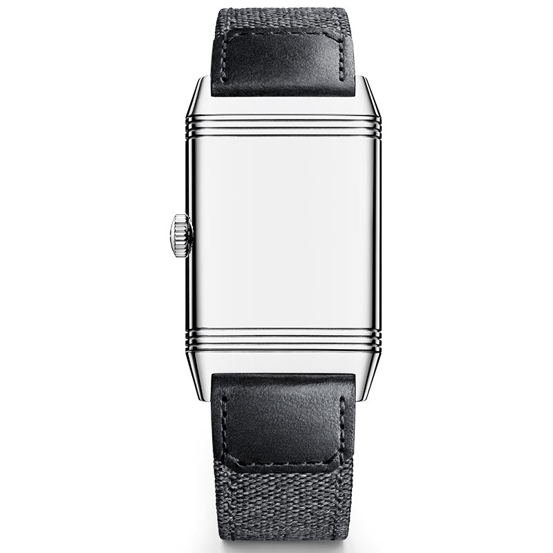 Jaeger-LeCoultre Reverso Tribute Monoface Small Seconds Q713842J watch. In its 8.51 mm stainless steel case, the Reverso Tribute Small Seconds focuses on reversible time. Equipped with the Manufacture’s hand-wound caliber 822, and with each component carefully decorated, it incorporates a small seconds hand at 6 o’clock, giving a hint of the mechanical ingenuity within. On the opaline dial, the pure lines of the gadroons, minute hand, applied indexes and deep black Dauphine hands evoke the Art Deco-inspired aesthetic codes of the first Reverso created in 1931. This model, which features a customizable back, includes a black strap in two materials (leather/canvas) designed by Casa Fagliano.