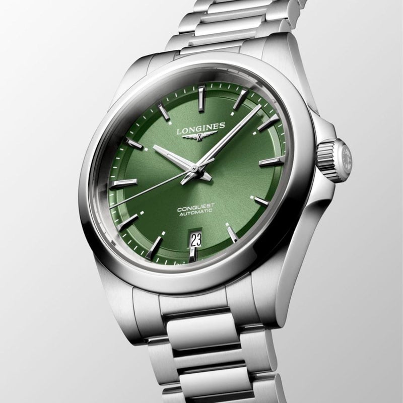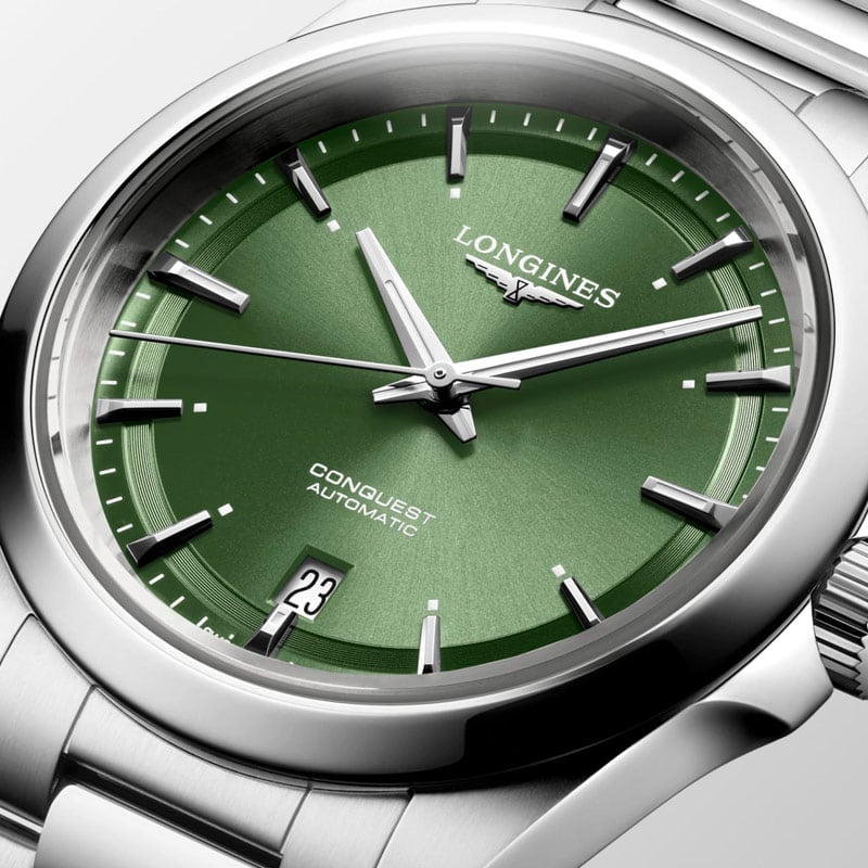 The Longines Conquest L37204026 watch is an iconic model reinterpreted in a green dial with “sunray” effect combined with a stainless steel bracelet. The reference L3.720.4.02.6 incorporates the exclusive Longines L888 caliber with automatic mechanical movement, which provides a power reserve of approximately 72 hours. It has a stainless steel case of 38mm diameter. The elegance and simplicity of these models have made the Conquest collection a timeless classic.
