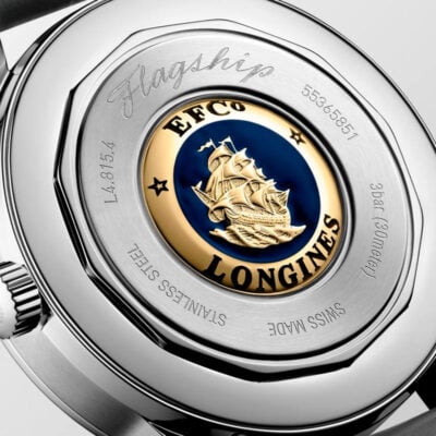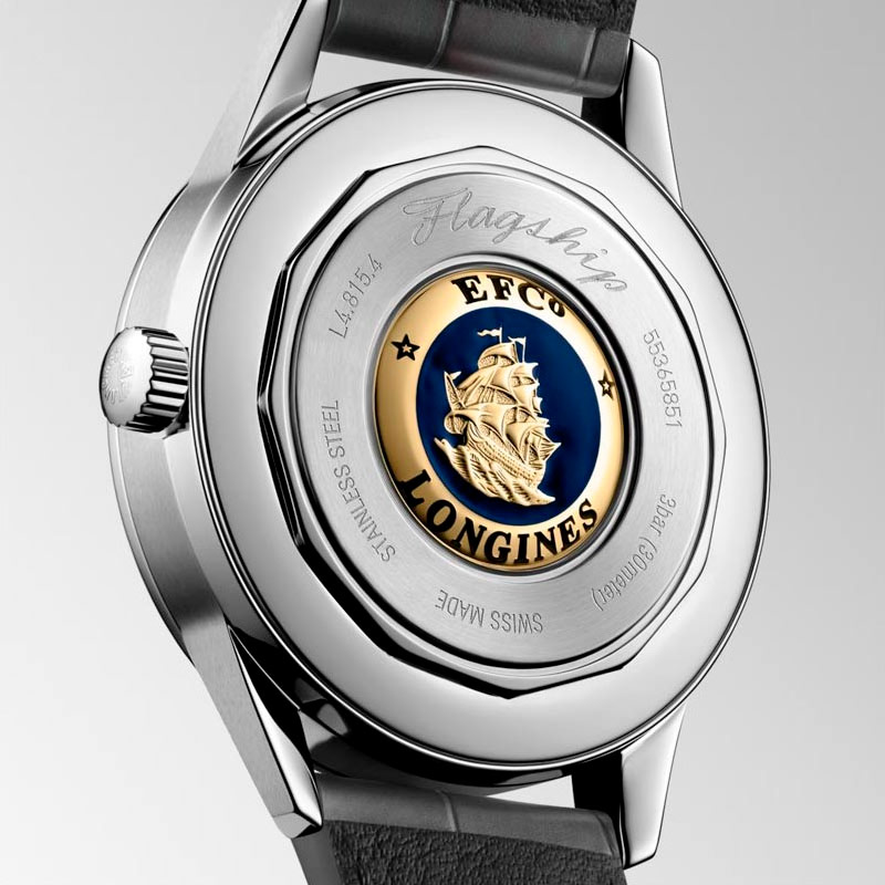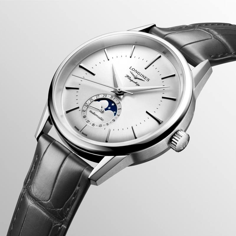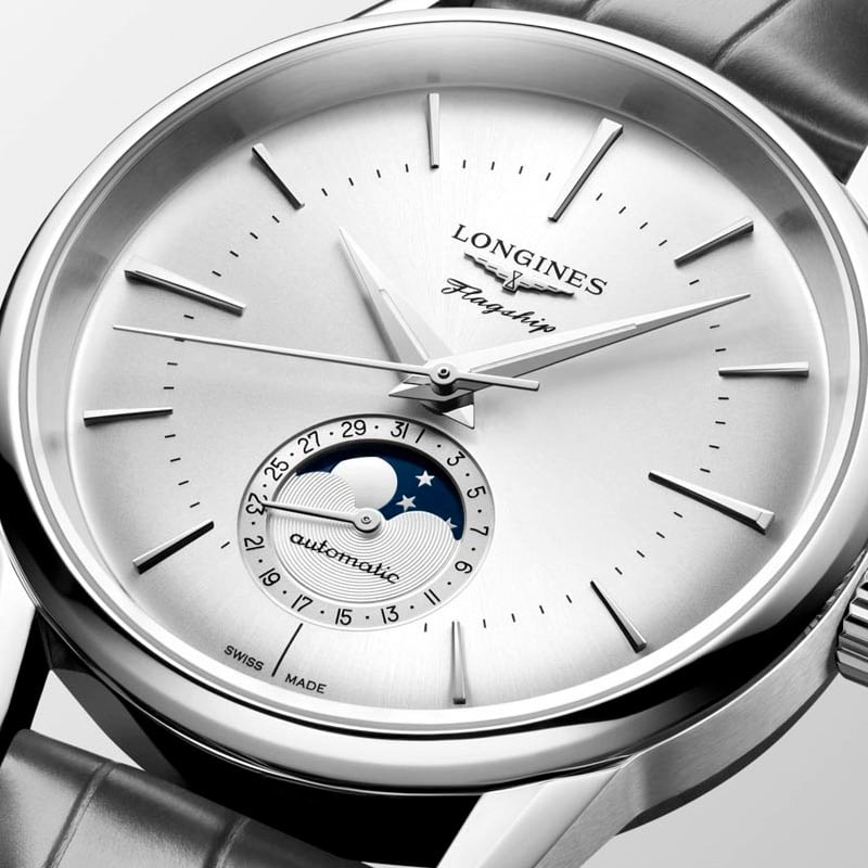 The Longines Flagship Heritage Moonphase L48154722 watch is an iconic model reinterpreted in a silver dial with “sunray” effect combined with a grey alligator leather strap. The reference L4.815.4.72.2 incorporates the exclusive Longines L899 caliber with automatic mechanical movement, which provides a power reserve of approximately 72 hours. It has a stainless steel case of 38.5mm diameter.