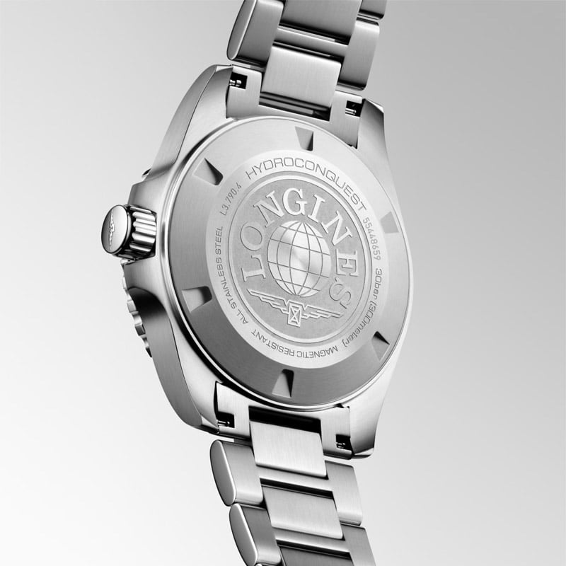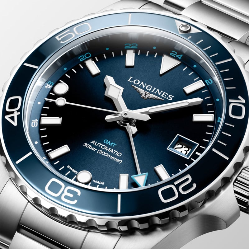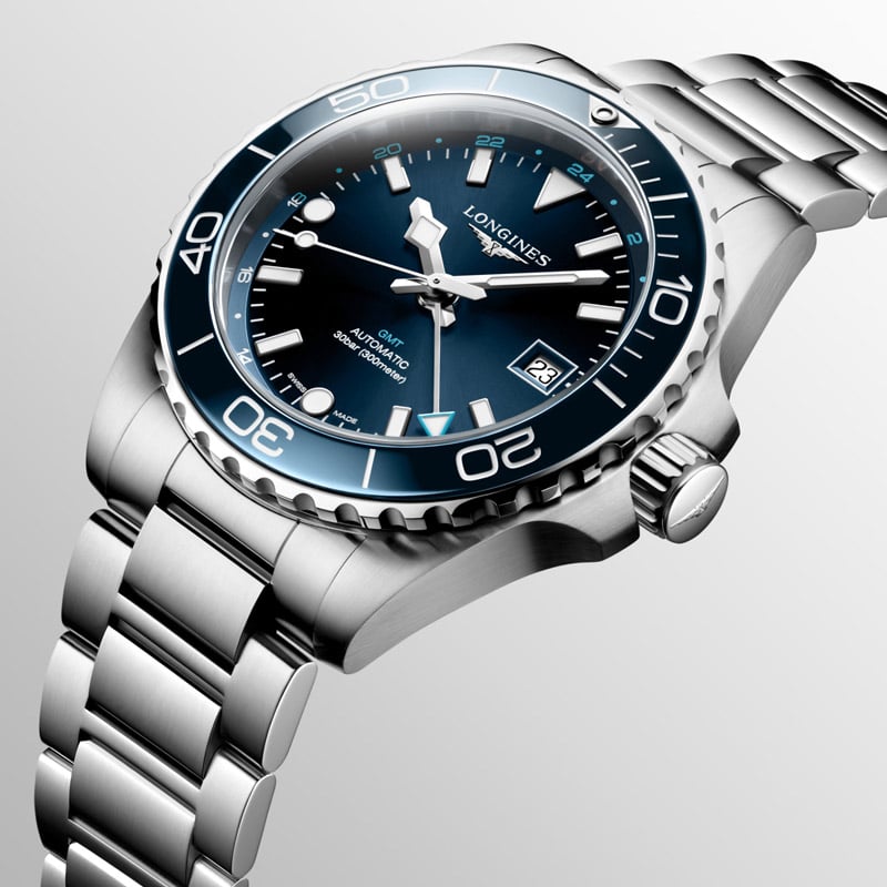 The Longines HydroConquest GMT L37904966 watch has a 41mm diameter stainless steel case that perfectly matches its ceramic unidirectional rotating bezel and stainless steel bracelet. The reference L3.790.4.96.6 is equipped with an exclusive Longines GMT movement that displays the time in two time zones. In addition, it offers a water resistance of 300m, making it the perfect companion for underwater adventures.