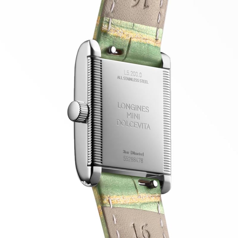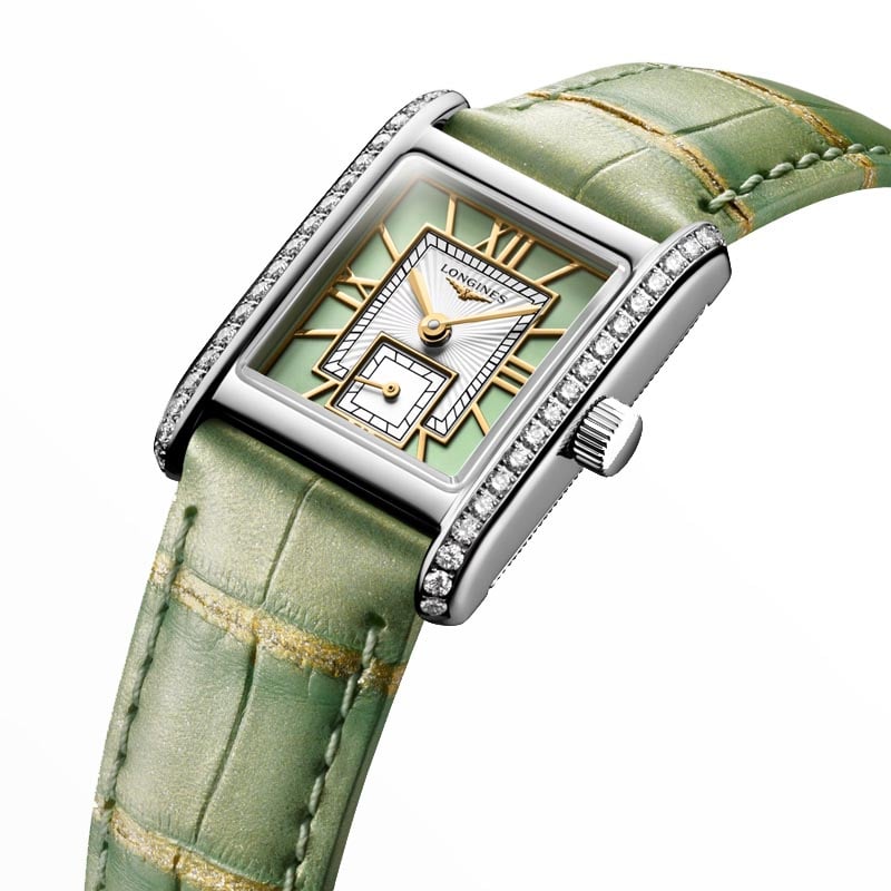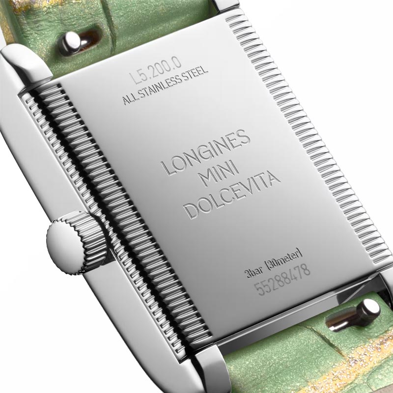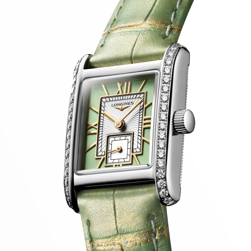 The Longines MIni Dolcevita L52000052 watch may be small, but its classic styling and aesthetic variations, both timely and timeless, make it a masterpiece that exquisitely expresses, in equal parts, the quiet luxury and contemporary elegance of Longines. The reference L5.200.0.05.2 dazzles with a case framed by 38 IF-VVS Top Wesselton diamonds, and a rectangular green Roman dial inside the case draws attention to its uncompromising elegance.