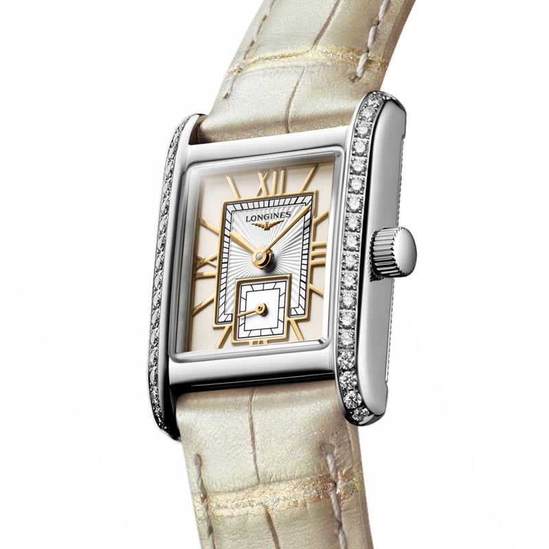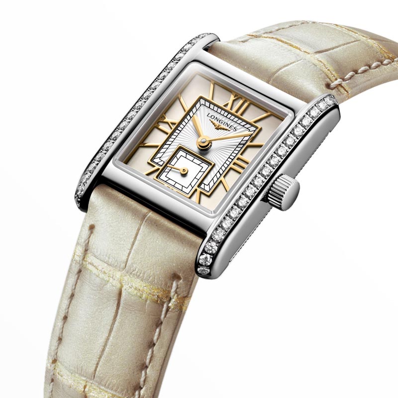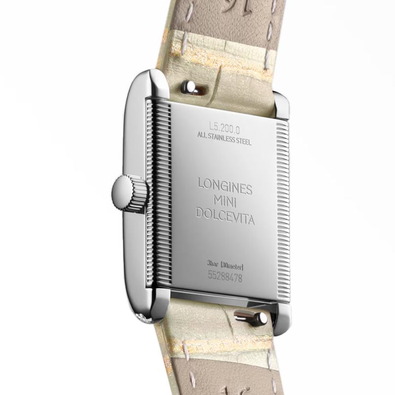 The Longines MIni Dolcevita L52000792 watch may be small, but its classic style and aesthetic variations that are both timely and timeless make it a masterpiece that exquisitely expresses, in equal parts, the quiet luxury and contemporary elegance of Longines. The reference L5.200.0.79.2 dazzles with a case framed by 38 IF-VVS Top Wesselton diamonds, and a rectangular ivory-colored Roman dial inside the case draws attention to its uncompromising elegance.