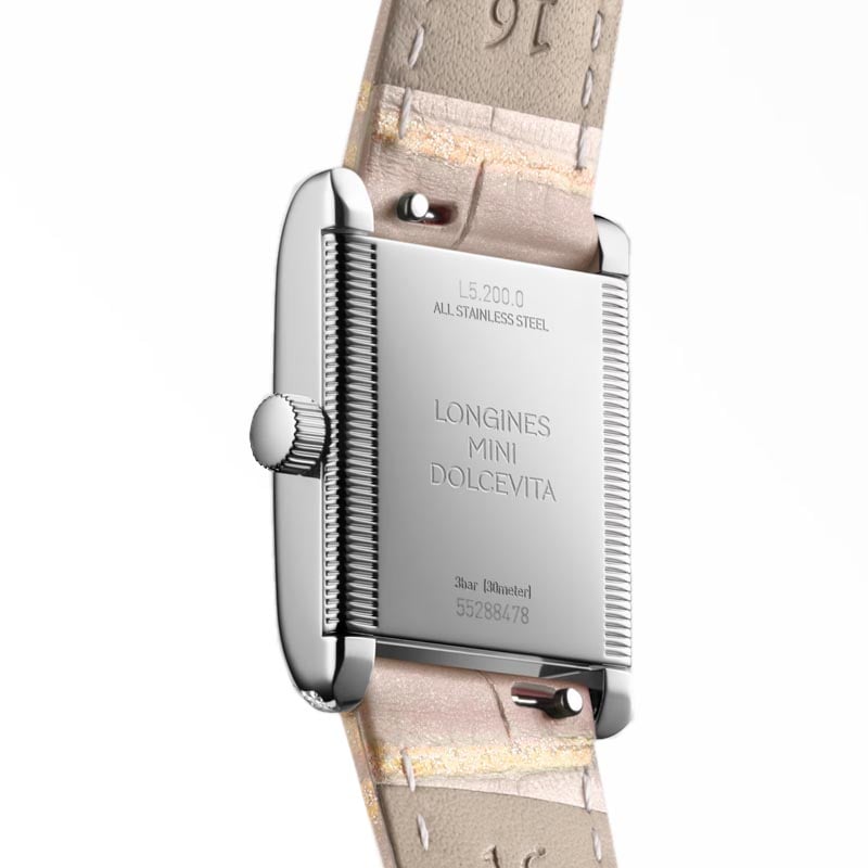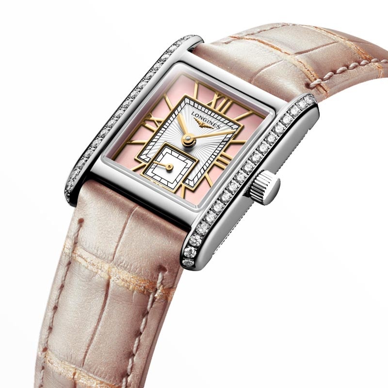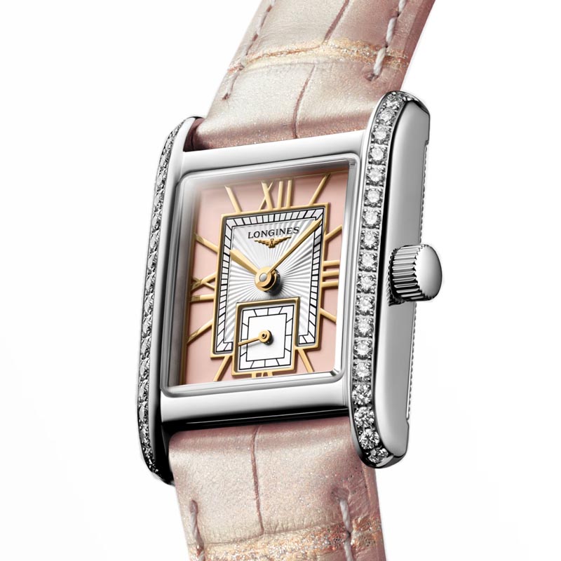 The Longines MIni Dolcevita L52000992 watch may be small, but its classic style and aesthetic variations that are both timely and timeless make it a masterpiece that exquisitely expresses, in equal parts, the quiet luxury and contemporary elegance of Longines. The reference L5.200.0.99.2 dazzles with a case framed by 38 IF-VVS Top Wesselton diamonds, and a rectangular Roman pink dial inside the case draws attention to its uncompromising elegance.