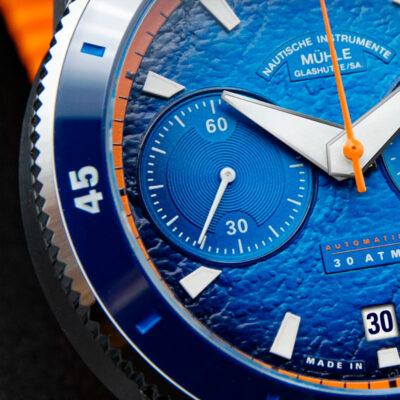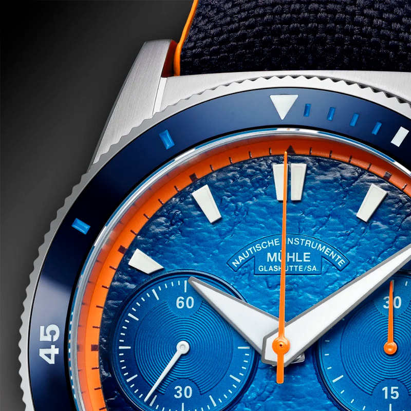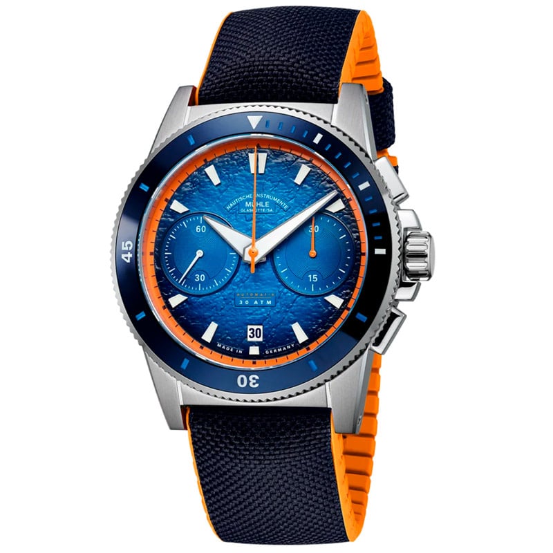 The Mühle Glashütte Sportivo Active Chronograph M1-52-02-CK watch features an sporty design, showcasing a blue dial with date window. It incorporates a black canvas and orange rubber strap that ensures comfort and durability. It has a polished stainless steel case with a diameter of 42,5mm. It has an automatic mechanical movement with MU 9419 Calibre, which provides a power reserve of 62 hours. Sporty design and high-quality materials characterize the Sportivo Active Chronograph, which fits perfectly in outdoor activities or business meetings.