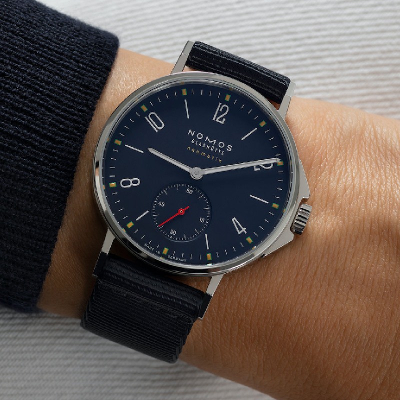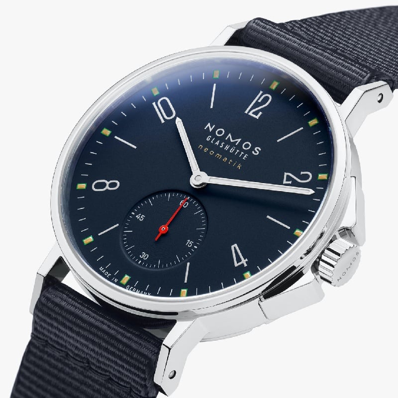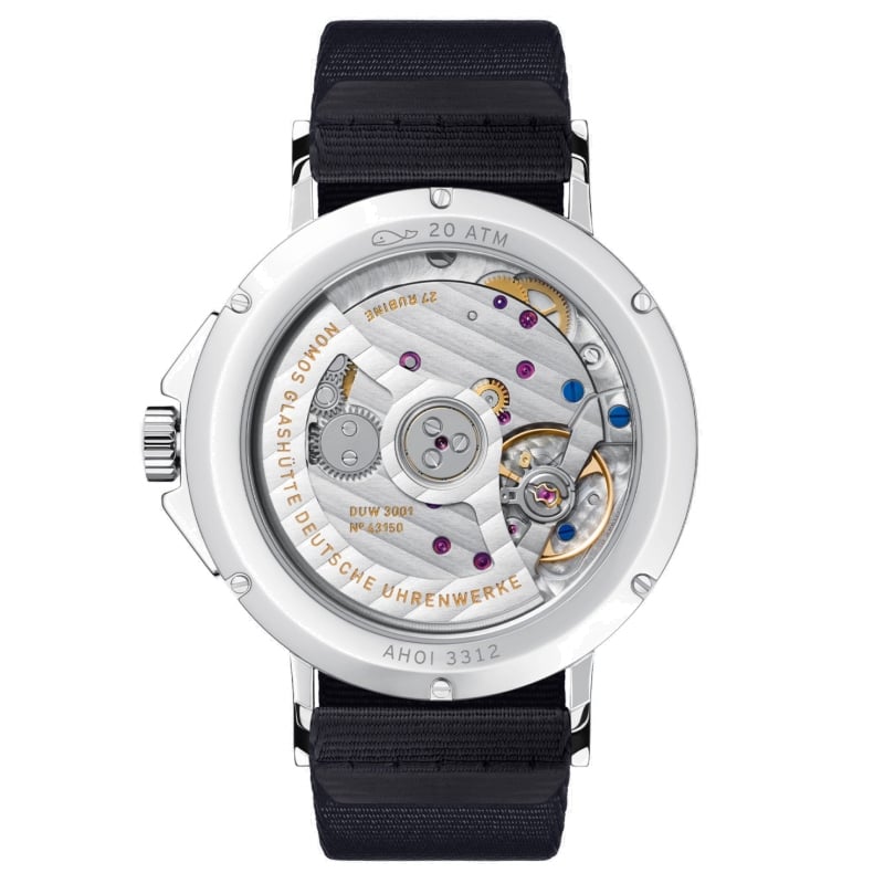 The NOMOS Glashütte watch Ahoi Neomatik Atlantic ref. 567 . is automatic, as it is equipped with the innovative technology of the high-precision DUW 3001 neomatik movement. The caliber, developed by NOMOS, measures only 3.2 mm in height – about nine postage stamps stacked together – making it particularly slim. The time is kept by the patented escapement, the famous NOMOS Swing System.