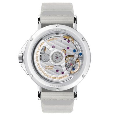 The NOMOS Glashütte Ahoi Neomatik ref. 560 watch: Ahoi is slightly smaller thanks to the ultra-thin automatic caliber DUW 3001 with NOMOS Swing System (visible through the sapphire crystal case back). Water resistant to 200 meters and suitable for diving. It has crown protection and its case back is secured with six screws. Elegance, sporty style and classic character in a diameter of 36 millimeters.