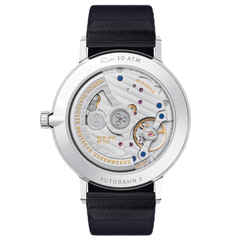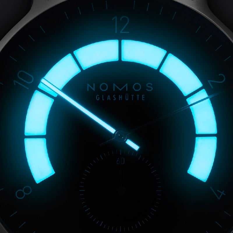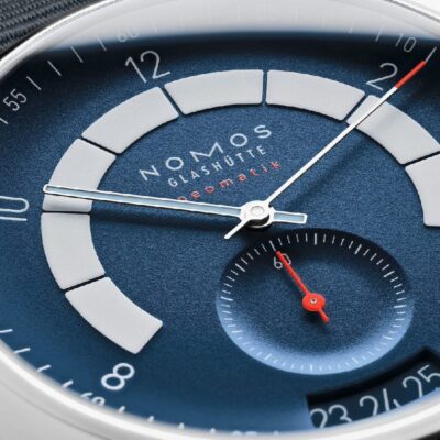 The NOMOS Glashütte Autobahn Neomatik 41 Date Midnight Blue ref. 1302 features superluminova coating on the dial and hands. The elongated date window and the fluid curvature of the dial are the major new features of the model.