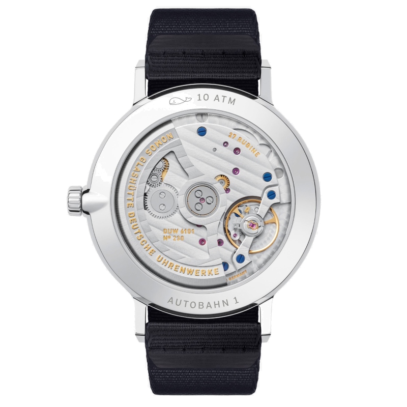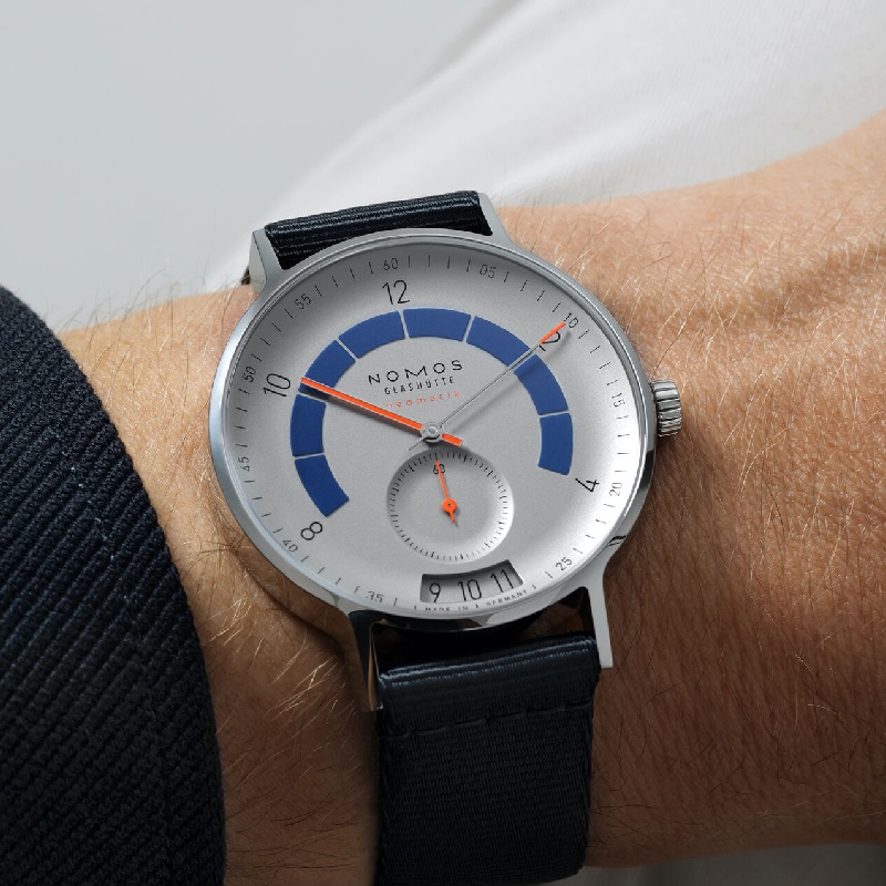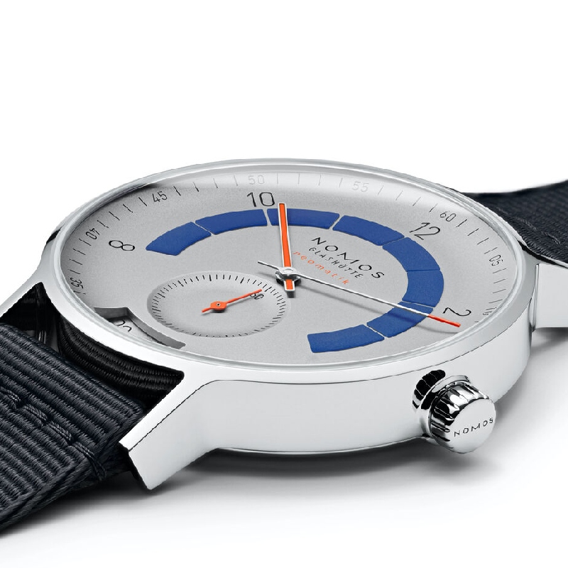 The NOMOS Glashütte Autobahn Neomatik 41 Date Sports Gray ref. 1303 watch: The racing model of the three Autobahn versions wears blue with gray background and neon orange hands. A distinguished and self-confident watch with a slim bezel, attractive crown and captivating dial.