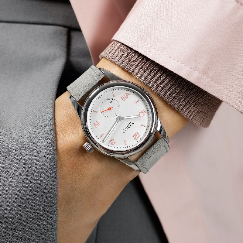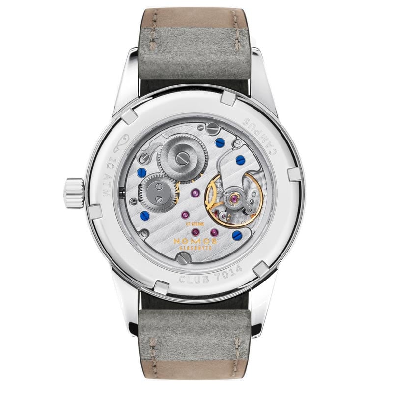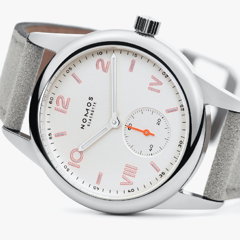 The NOMOS Glashütte Club Campus ref. 709 watch features a 36mm stainless steel case, white dial and a sapphire crystal that can handle anything. The hands and indexes glow in the dark, and the dial displays two Roman numerals along with Arabic numerals.