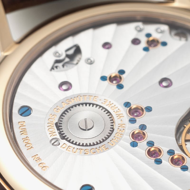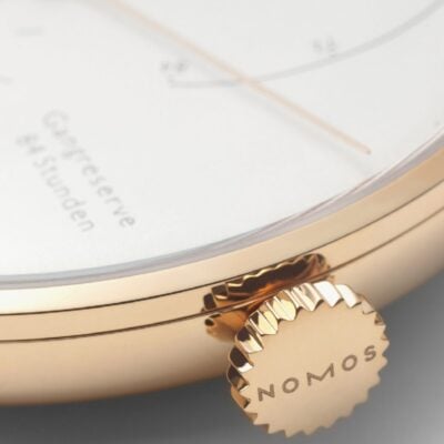 The NOMOS Glashütte Lambda 39 ref. 952 watch features the highest quality and elegance in a diameter of 39 millimeters. The gold ring on the case keeps the dial in position under the domed sapphire crystal. With its generous power-reserve indicator, the dial is as delicate as a pencil sketch.