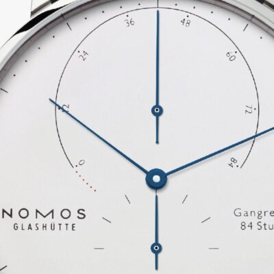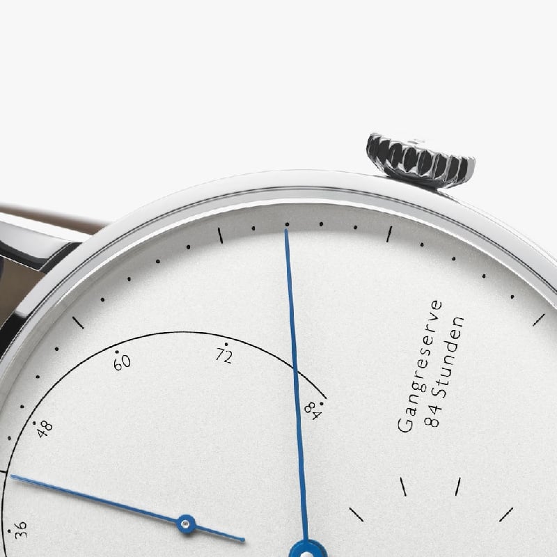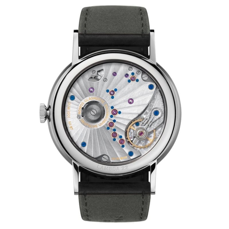 The NOMOS Glashütte Lambda White Gold ref. 933 watch has an 18K white gold case 42mm diameter, silvered white galvanized dial with blue tempered hands and Horween Genuine Shell Cordovan strap in black “rembordé” padded with a lug width of 22mm.