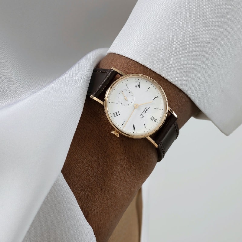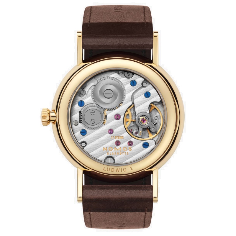 The NOMOS Glashütte Ludwig Gold 33 ref: 210 watch: The best things come in small packages. This watch is a classic with its Roman numerals and gold case. A recessed gold bezel frames the silver-white dial, the slight curvature of the lugs traces the shape of the wrist for optimal comfort.