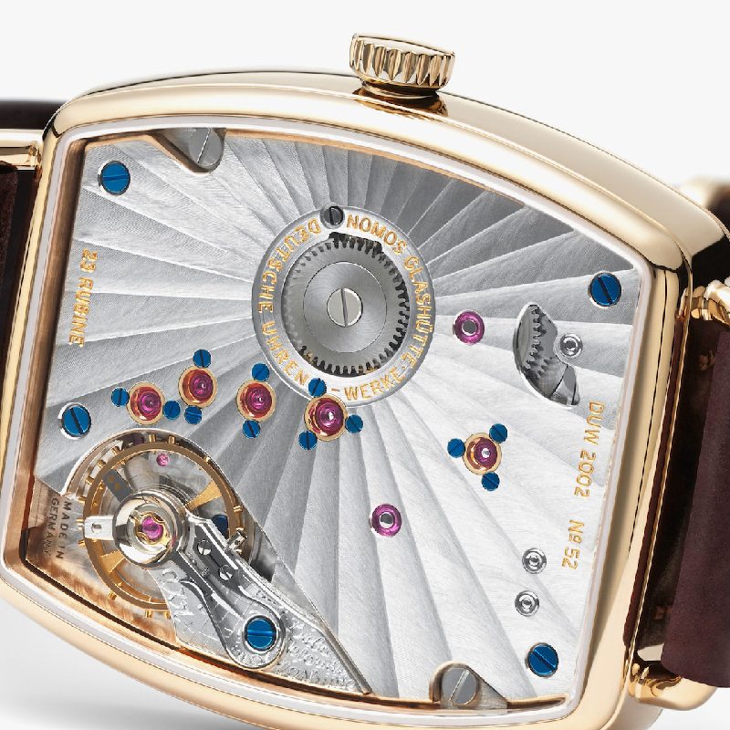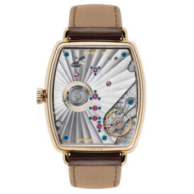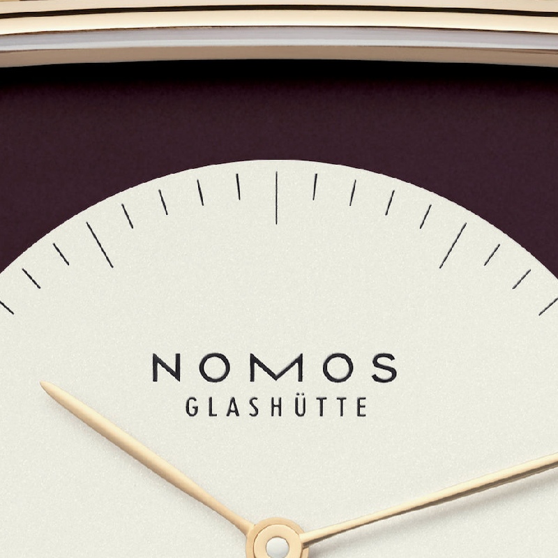 The NOMOS Glashütte Lux Zobel ref. 942 watch features a 34mm diameter 18K rose gold case, silver white galvanized dial with dark eggplant print and Horween Genuine Shell Cordovan strap in dark brown “rembordé” padded “rembordé” with 17mm lug width.