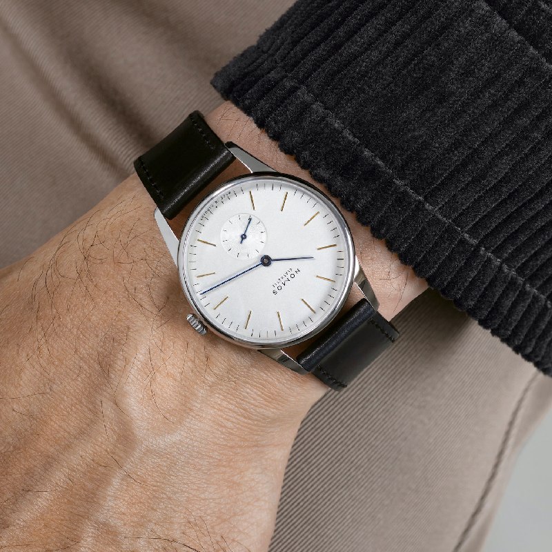 The NOMOS Glashütte Orion ref. 309 watch is the favorite model of many NOMOS designers. Minimalist and clean, it is reduced to the essentials. This hand-wound version with gold indexes and tempered blue hands on a silver-white dial will become a timeless companion for life.