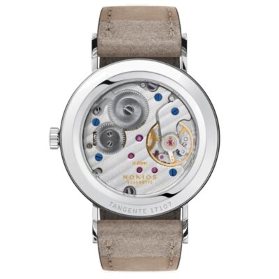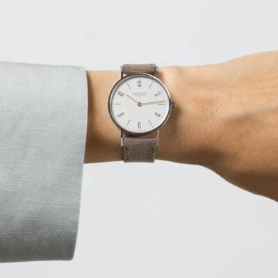 The NOMOS GLASHÜTTE Tangente 33 Duo ref. 127 watch has a stainless steel case, silver-white dial and two golden hands, perfect for any occasion and to combine with any type of jewelry.