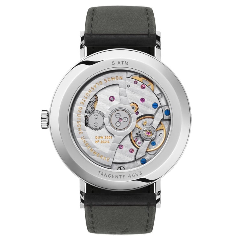 The NOMOS GLASHÜTTE Tangente Neomatik 39 Blue Gold ref. 146 watch features a perfectly cylindrical and flat case, angular lugs and linear typography. In addition, its thin bezel, rhodium-plated hands and serif typeface numerals endow the model with minimalist elegance.