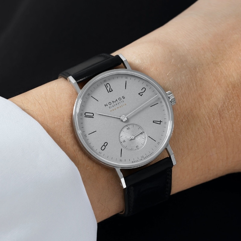 The NOMOS Glashütte Tangente Neomatik Platinum Gray ref. 189 watch features a bi-directional winding rotor that absorbs kinetic energy, thus preserving the winding spring of this durable timepiece.