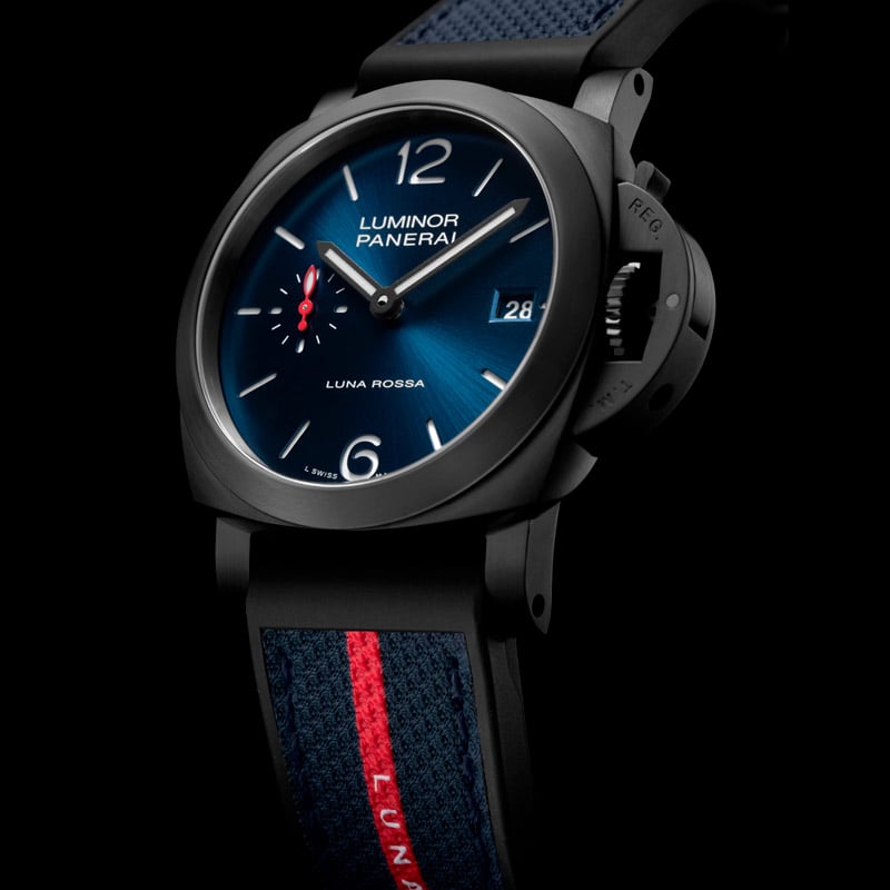 The Panerai Luminor Quaranta Steel DLC Luna Rossa PAM01408watch features an elegant design, showcasing a blue sun-brushed dial. It incorporates a dark blue fabric and rubber strap that ensures comfort and durability. It has an eSteel™ DLC polished steel case with a diameter of 40mm. It features an automatic mechanical movement with caliber P.900, which provides a power reserve of 3 days. The Luminor collection is the essence of Panerai and a symbol of Italian design and Swiss watchmaking.