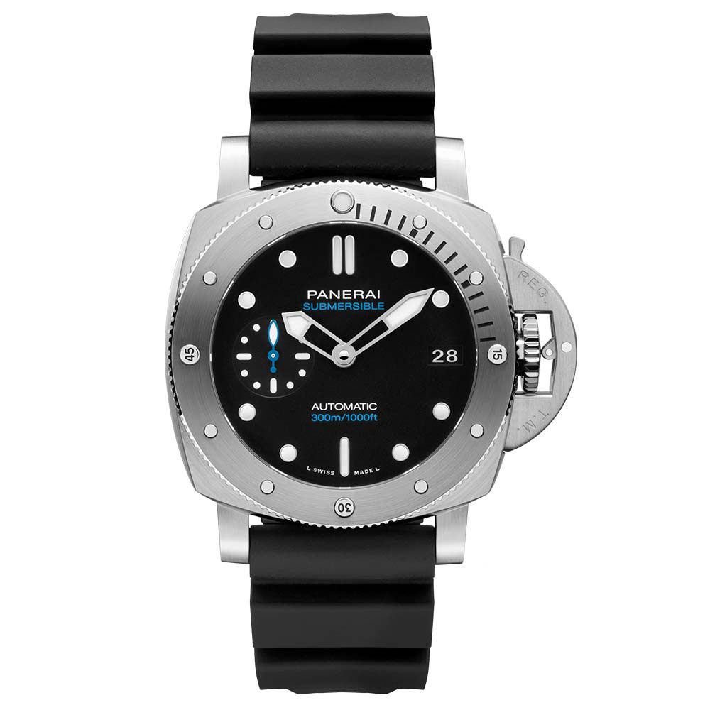 Panerai Submersible 42mm PAM02973 watch with automatic movement. Stainless steel case 42 mm diameter, water-resistant to 300 m. Black dial and rubber strap.