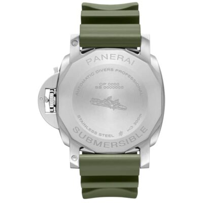Panerai Submersible QuarantaQuattro Bianco PAM 01226 watch with automatic movement. Satin-brushed steel case 44 mm diameter, water-resistant to 300 m. White dial with rubber strap. military green
