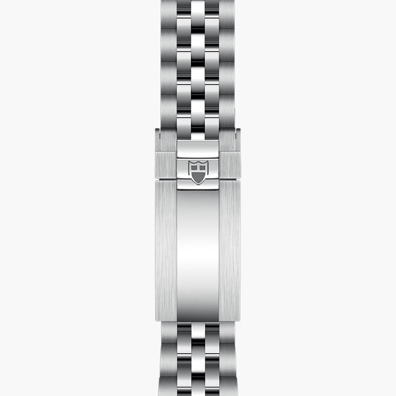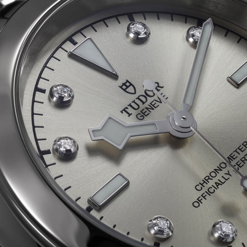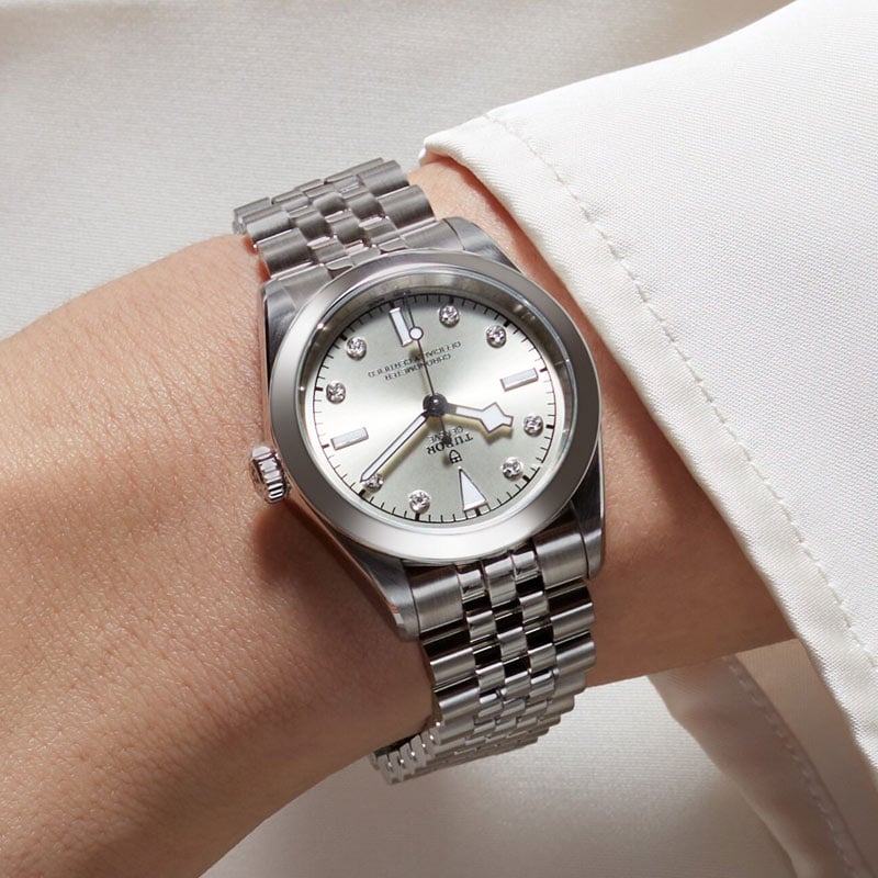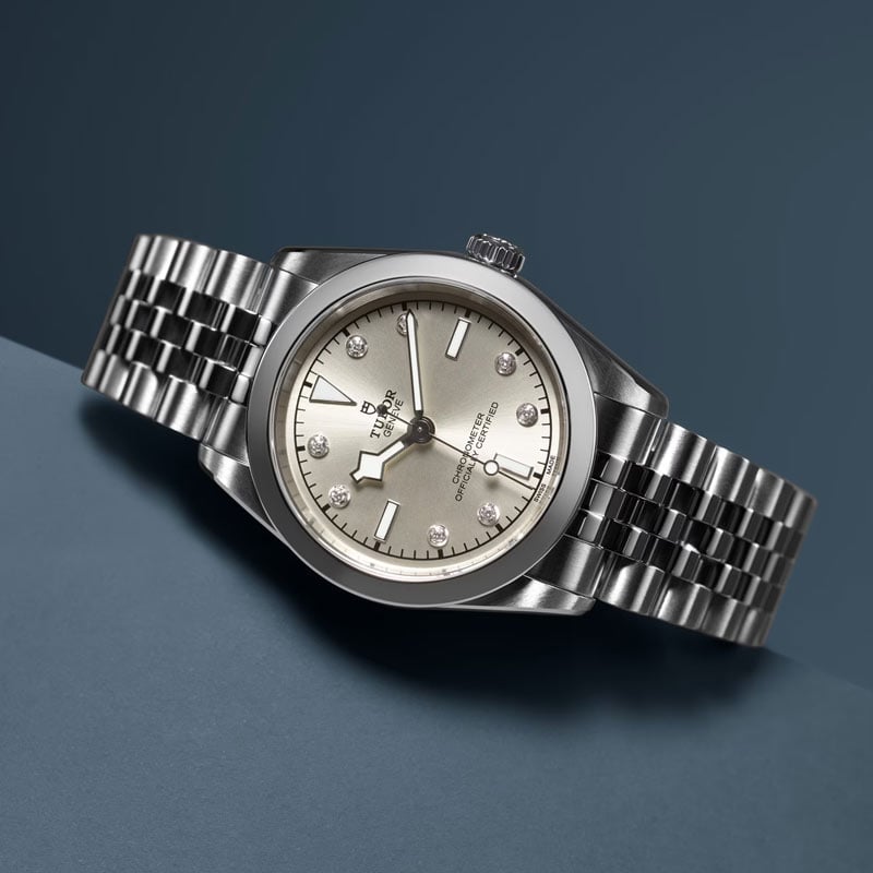 Tudor Black Bay 31 M79600-0006 watch with self-winding mechanical movement. 31 mm diameter stainless steel case, water-resistant to 100 m. Light champagne dial with 8 diamonds and steel bracelet.