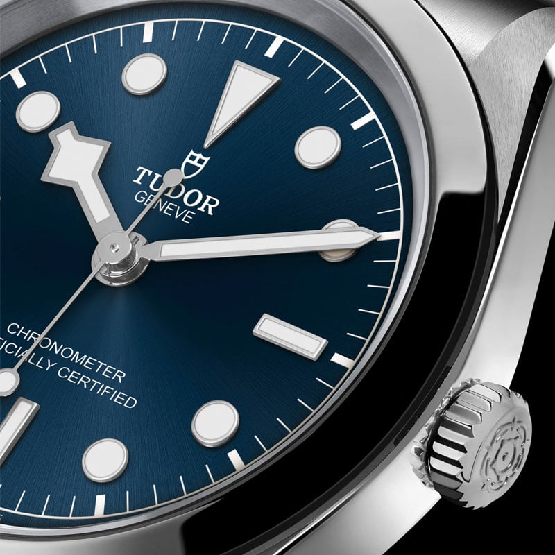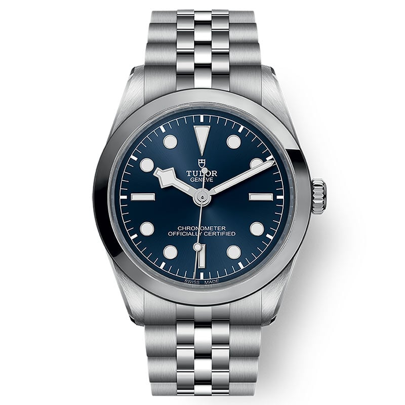 Tudor Black Bay 36 M79640-0002 watch with self-winding mechanical movement. 36 mm diameter stainless steel case, water-resistant to 100 m. Blue dial and steel bracelet.