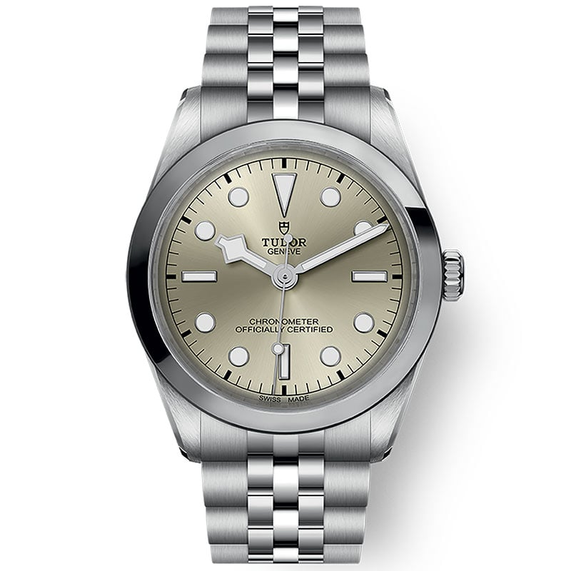 Tudor Black Bay 36 M79640-0003 watch with self-winding mechanical movement. 36 mm diameter stainless steel case, water-resistant to 100 m. Light champagne dial and steel bracelet.