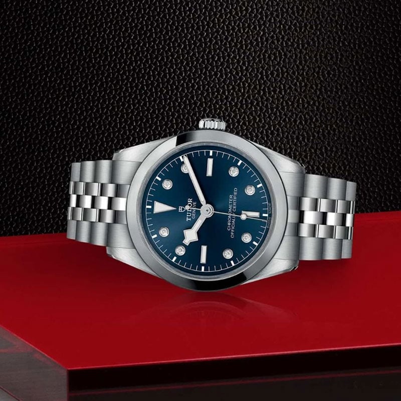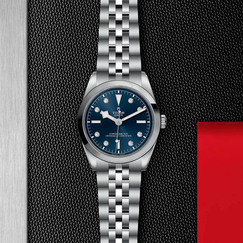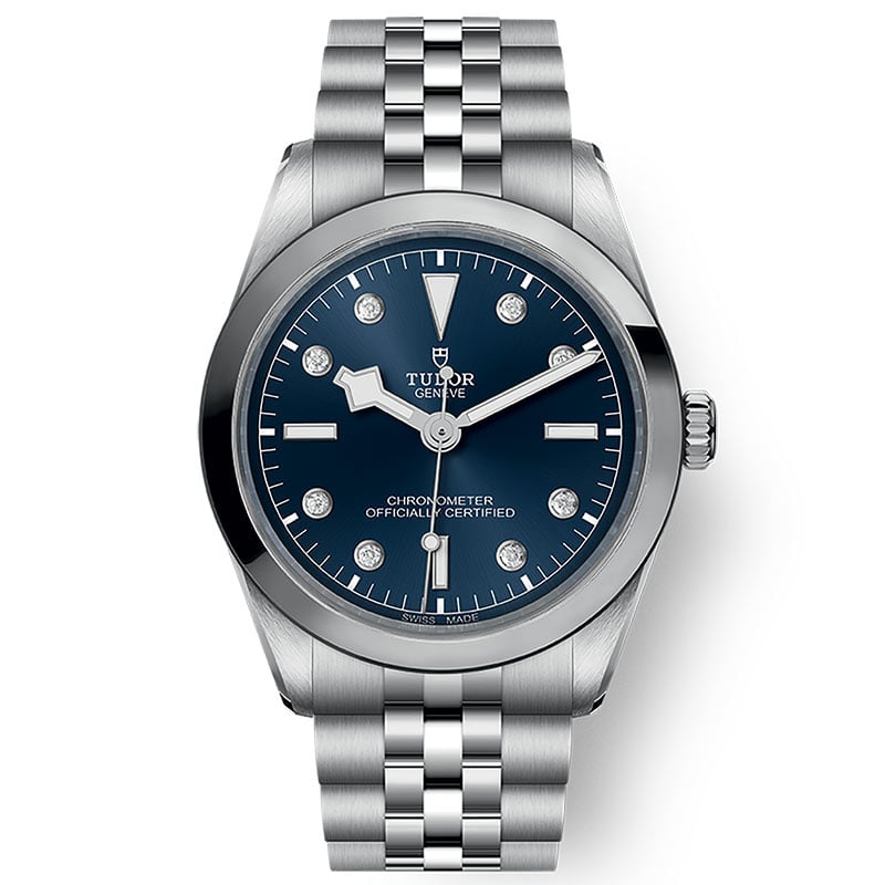Tudor Black Bay 36 M79640-0005 watch with self-winding mechanical movement. 36 mm diameter stainless steel case, water-resistant to 100 m. Blue dial with 8 diamonds and steel bracelet.