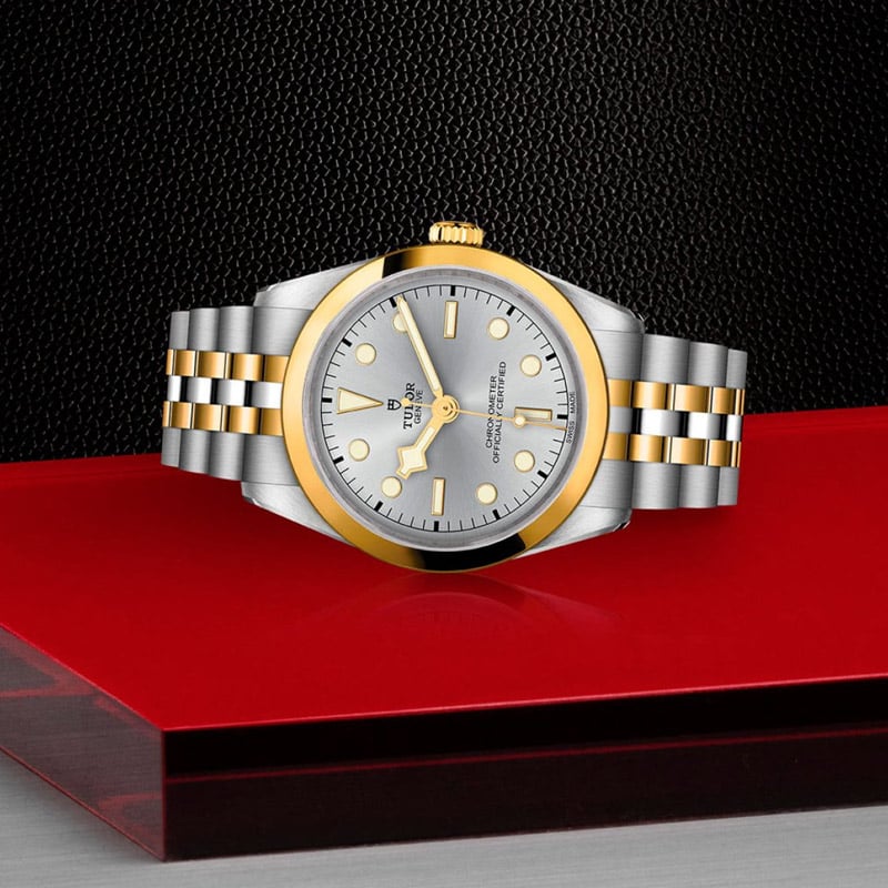 Tudor Black Bay 36 S&G M79643-0002 watch with self-winding mechanical movement. 36 mm diameter stainless steel case, water-resistant to 100 m. Silver dial and steel and yellow gold bracelet.