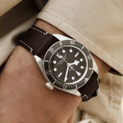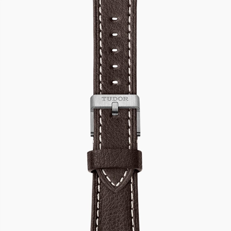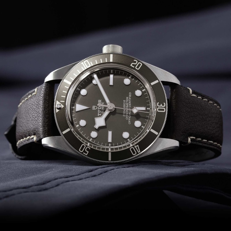 Tudor Black Bay Fifty-Eight 925 M79010SG-0001 automatic movement watch. 39 mm diameter silver case, water-resistant to 200 m. Grey dial and leather strap.