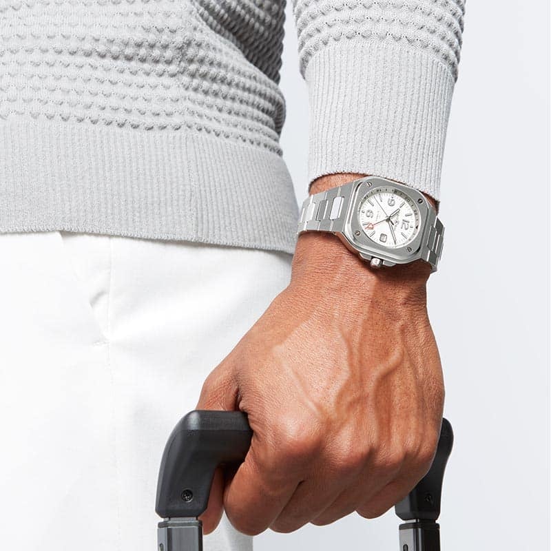 El reloj Bell & Ross BR 05 GMT White BR05G-SI-ST-SST tiene dos características fuertes: la función GMT y una esfera plateada opalina. No solo es práctico por su indicación de doble huso horario, sino también atractivo, por su gran distinción. El acabado mate de su esfera, la precisión y la legibilidad, lo hacen  a la vez sutil y sofisticado,