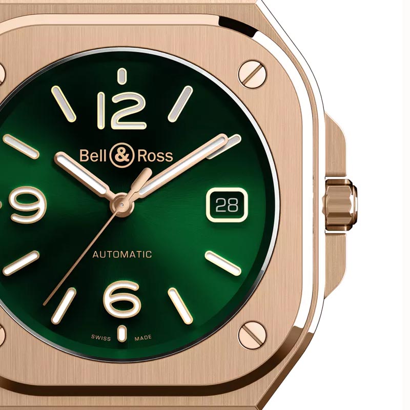 El reloj Bell & Ross BR 05 Green Gold BR05A-GN-PG-SPG es el tercer eslabón de la familia Gold, Su caja y brazalete integrados están fabricados íntegramente en oro con un diseño limpio y elegante, con un aura vanguardista. La nueva esfera de tono verde adquiere una tonalidad luminosa y su efecto sol hace que cambie de color cuando se inclina.