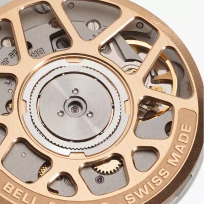 - Caja: 40 mm de diámetro de grosor 10,33 mm de oro rosa de 18 K pulido y satinado. Corona enroscada. Protección de la corona. Fondo de zafiro y oro rosa de 18 K con masa oscilante de 360° chapada en oro rosa de 18 K.