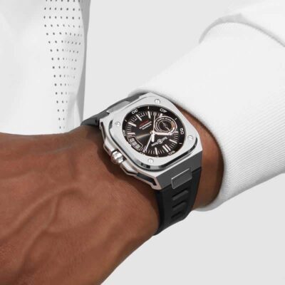 El reloj Bell & Ross BR-X5 Black Steel BRX5R-BL-ST-SRB tiene un diseño y características técnicas que lo posicionan como un BR 05 superlativo. Está equipado con un prestigioso movimiento de manufactura, que alcanza nuevas cotas de precisión. Su caja multicomponente es resistente y ligera, además de ser hermética gracias a cuatro tornillos.,