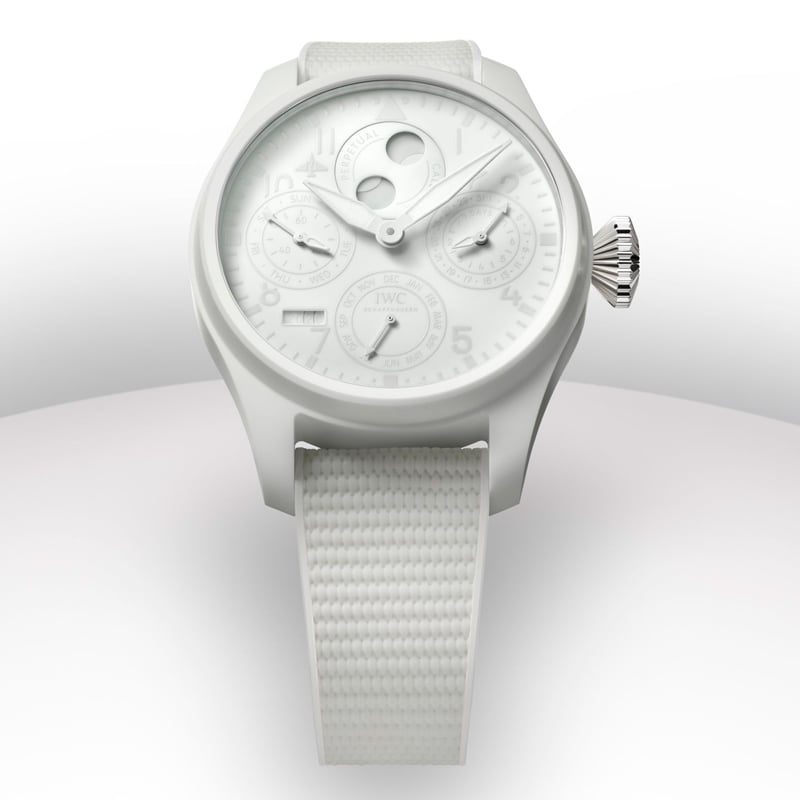 Con el Gran Reloj IWC de Aviador Calendario Perpetuo IW503608 de Aviador Calendario Perpetuo Ceralume®, la tecnología de cerámica luminiscente patentada de IWC Schaffhausen debuta en la colección de Relojes de Aviador. Este reloj, que hace alarde de dos personalidades completamente diferentes, cautiva con sus sutiles tonos de blanco y gris a la luz del día, y se transforma en un instrumento con un intenso brillo azul en la oscuridad.