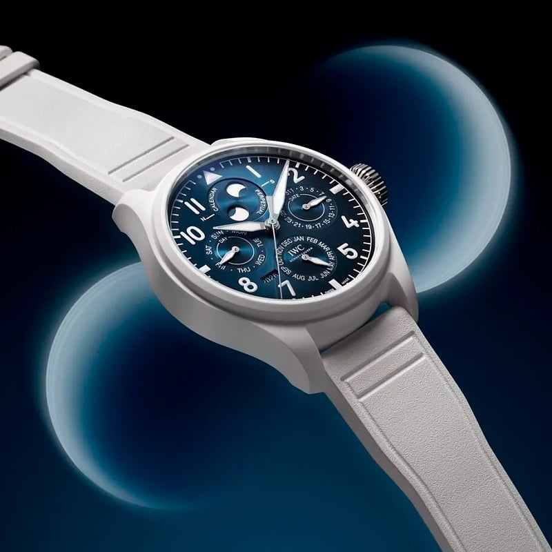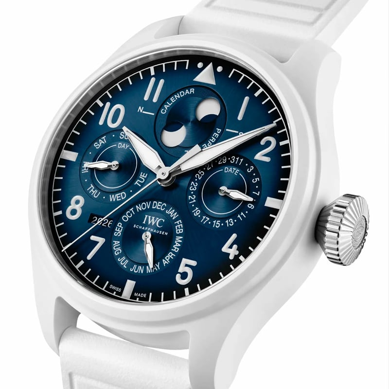 El IWC Gran Reloj de Aviador Calendario Perpetuo ProSet ‘Le Petit Prince’ IW339601 combina una caja de cerámica blanca con un degradado en color azul profundo y un acabado de rayos de sol. El modelo Calendario Perpetuo ProSet se ajusta hacia adelante y hacia atrás mediante una única posición de la corona, con lo que realizar ajustes en la fecha resulta tan fácil e intuitivo como cambiar la hora.