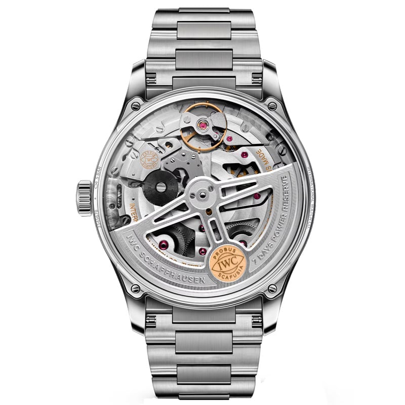 • Mecanismo: Movimiento de la manufactura IWC, cuerda automática. Frecuencia 28.800 VPH (4.0 Hz). Calibre 52011.