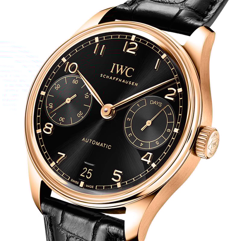 El reloj IWC Portugieser Automático 42 IW501707 destaca por su diseño elegante, que exhibe una esfera negra con ventana de fecha. Tiene una caja de oro rojo de 18 quilates de 42,4mm de diámetro. Incorpora una correa de piel de aligátor negra que garantiza un ajuste perfecto en la muñeca y ofrece un excelente confort de uso. La combinación de estilo y elegancia otorgan al Portugieser un carácter icónico propio de IWC Schaffhausen.