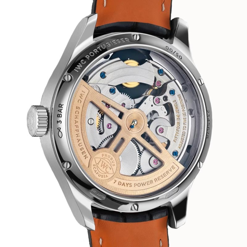 - Mecanismo: Movimiento de la manufactura IWC, cuerda automática. Frecuencia 28800 VPH (4.0 Hz). Calibre 51950.
