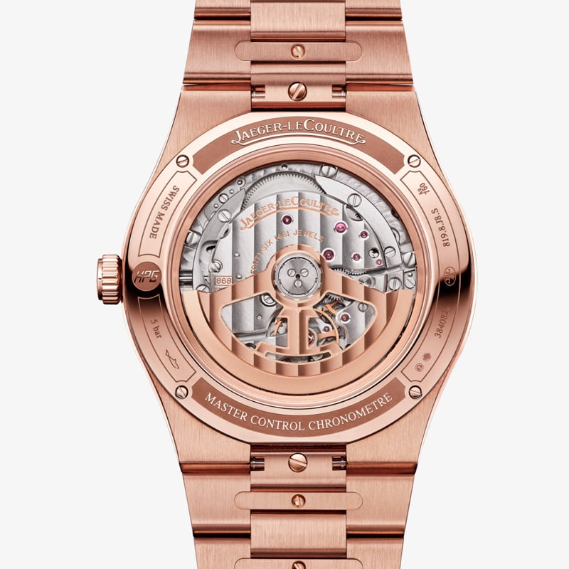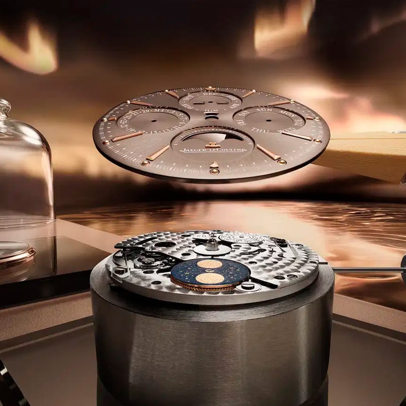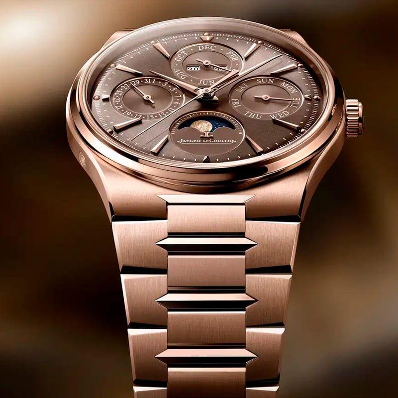 Reloj Jaeger-LeCoultre Master Control Chronometre Perpetual Calendar Q417216J. Una expresión refinada de su compromiso inquebrantable con la artesanía y la innovación. Elaborada en oro rosa de 18 quilates (750/1000), su caja de 39 mm enmarca una esfera con acabado cepillado tipo rayos de sol en color bronce. En ella, cuatro subesferas muestran el año, el mes, el día y la fecha, complementadas por una fase lunar a las 6 en punto que luce una luna de pan de oro martillado y acabados en opalina y azuré. La silueta es tan elegante como equilibrada, ofreciendo una presencia sofisticada en la muñeca