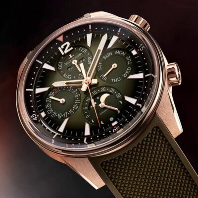 Reloj Jaeger-LeCoultre Polaris Perpetual Calendar Q908263J. El calendario perpetuo se considera una de las complicaciones relojeras más difíciles de dominar. El nuevo reloj Polaris Perpetual Calendar, deportivo y elegante, invita al aventurero de hoy en día a disfrutar de una precisión casi perpetua. Este nuevo reloj de Jaeger-LeCoultre, equipado con el calibre 868 y diseñado, fabricado y montado en la Manufactura, exhibe sus 351 componentes bajo su fondo de zafiro. Entre los avances integrados en este movimiento, se incluyen las fases lunares de ambos hemisferios, con una manecilla retrógrada para el hemisferio sur. La esfera, realzada mediante el bisel y las asas de la caja en oro rosa, luce un degradado impresionante en tonos verdes. Las manecillas y los marcadores de la hora luminiscentes destacan sobre el color verde, junto con las indicaciones del calendario perpetuo y las fases lunares. El reloj Polaris Perpetual Calendar está disponible también con un dúo de correas intercambiables: una de caucho verde y otra de piel de caimán de color negro con una hebilla desplegable.
